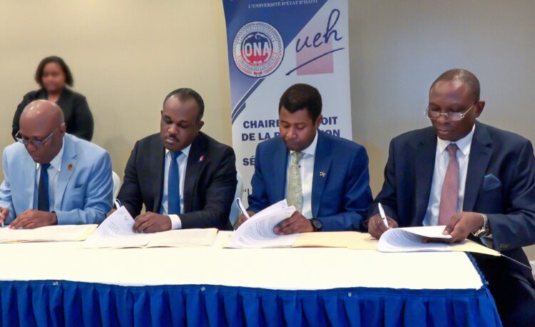 L’Université d’État d’Haïti (UEH) et l’Office National d’Assurance Vieillesse (ONA) ont paraphé le vendredi 14 novembre 2025, lors d’une cérémonie officielle à l’Hôtel Oasis, un accord de partenariat marquant la création et le lancement de la Chaire universitaire de Droit de la Protection et de la Sécurité Sociale en Haïti, une première dans l’histoire du pays.