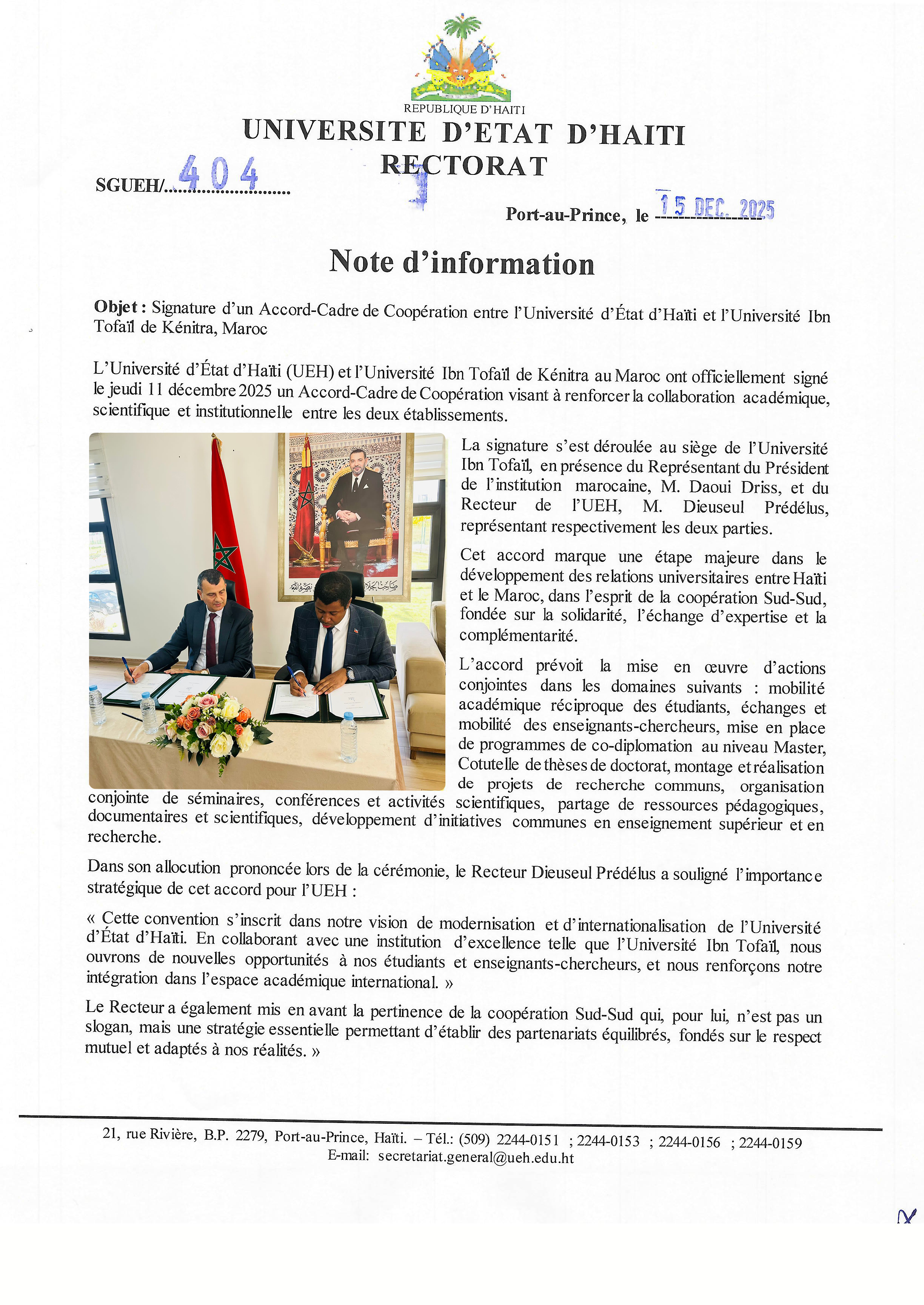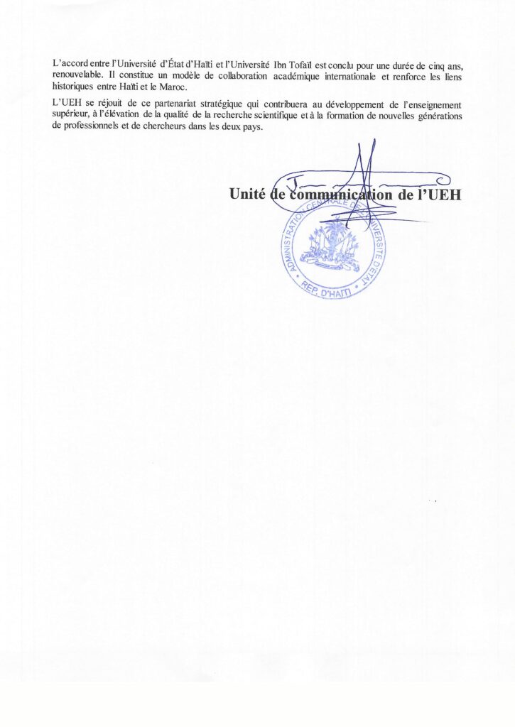 L’Université d’État d’Haïti (UEH) et l’Université Ibn Tofaïl de Kénitra au Maroc ont officiellement signé le jeudi 11 décembre 2025 un Accord-Cadre de Coopération visant à renforcer la collaboration académique, scientifique et institutionnelle entre les deux établissements.